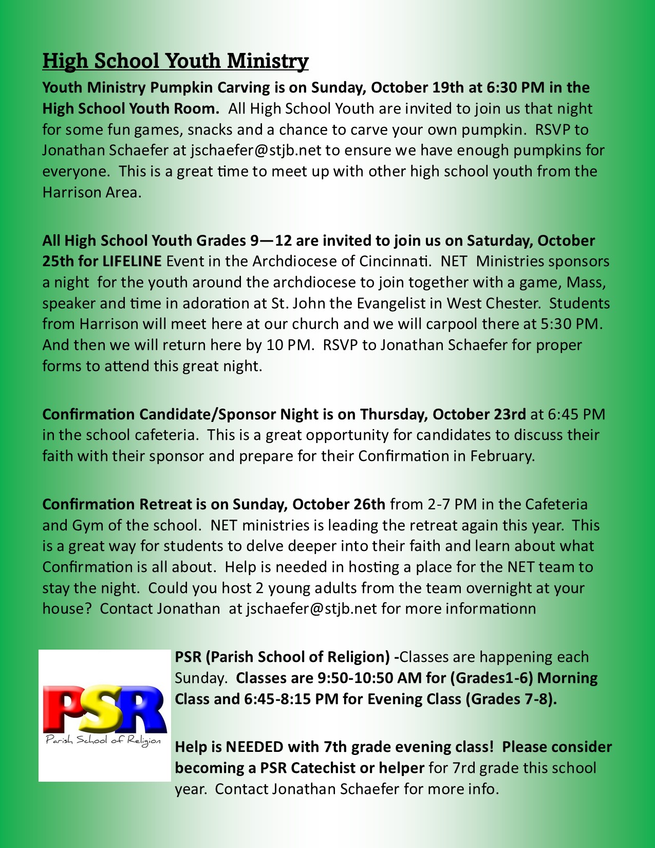 Will meet quarterly throughout the school year from 6:30pm - 8:30pm. Dates will be sent out in bulletin and by flocknote. This program will include dinner, fellowship and faith. We will join youth throughout the diocese for Youth events.